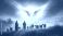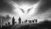 • Shepherds watching their flock in a field looking at an angel in the sky, emanating light.