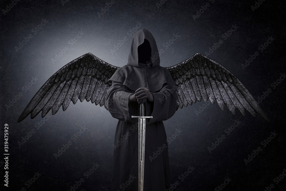 Anioł - Dark angel with medieval sword in the dark #319475929