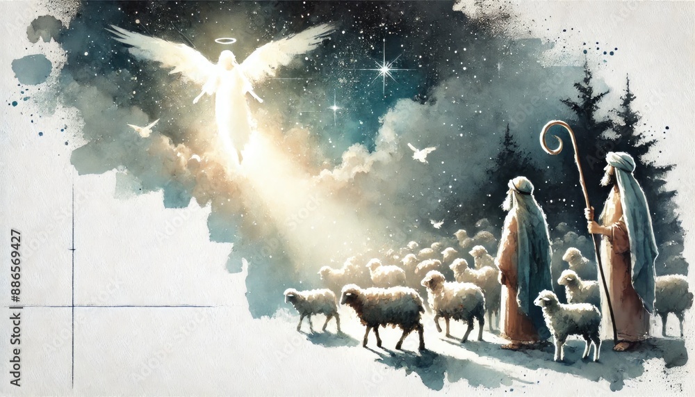 Anioł - Shepherds gaze at a radiant angel in the night sky, with their flock nearby. #886569427