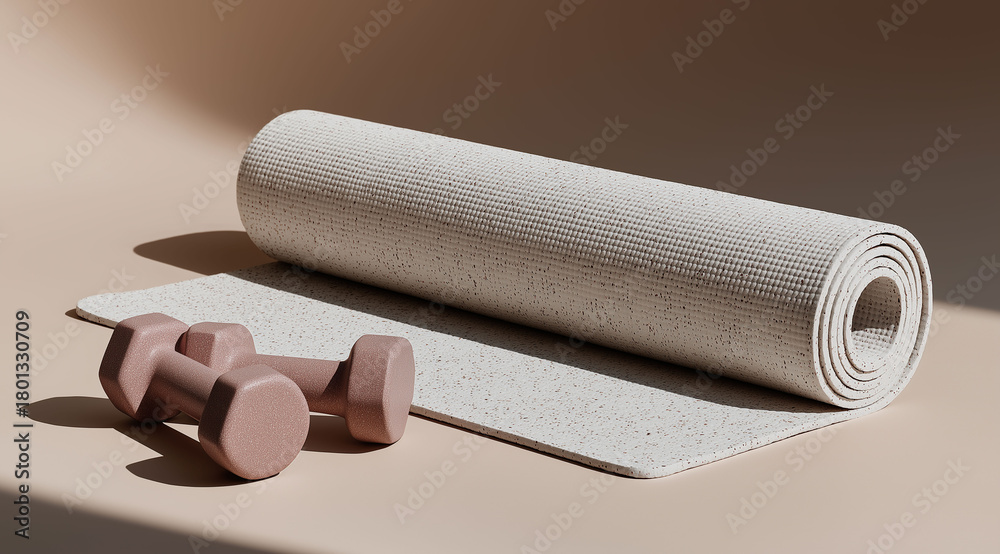• Rolled yoga mat positioned beside small dumbbells creates minimalist fitness composition.