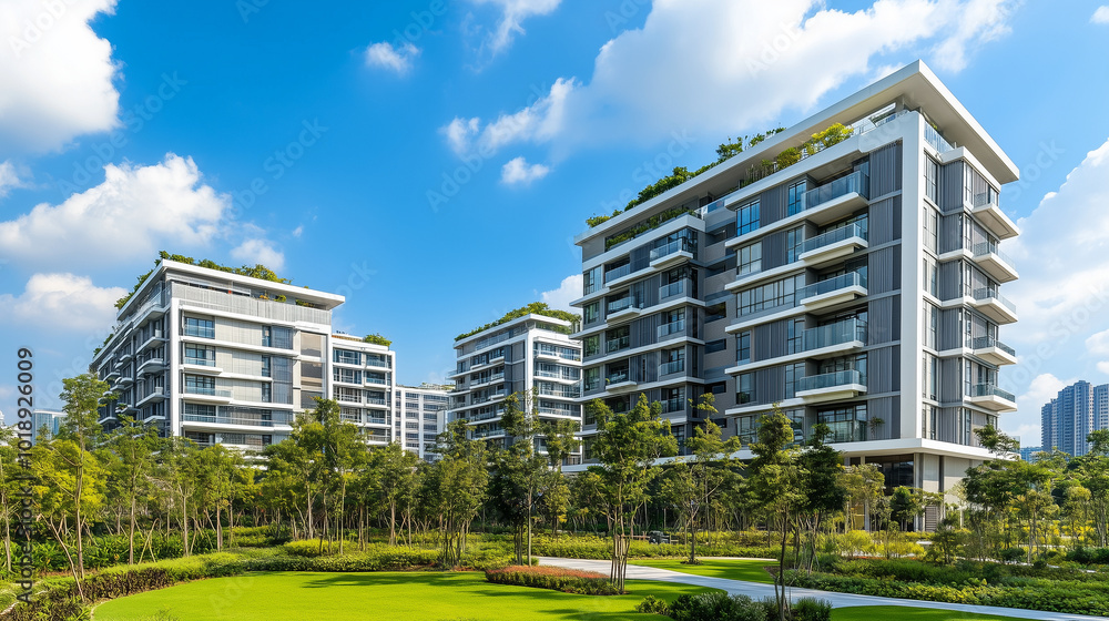 Obraz Architektura - Nowoczesne budynki mieszkalne wznoszą się w otoczeniu bujnej zieleni, tworząc idealną harmonię... #1018926009