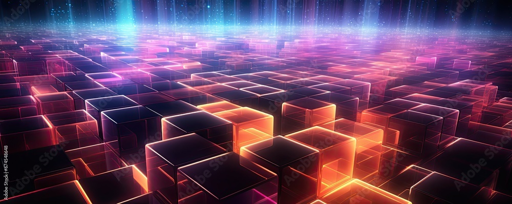 • Abstrakcyjne tło z kolorowych neonowych sześcianów z ledowymi światłami