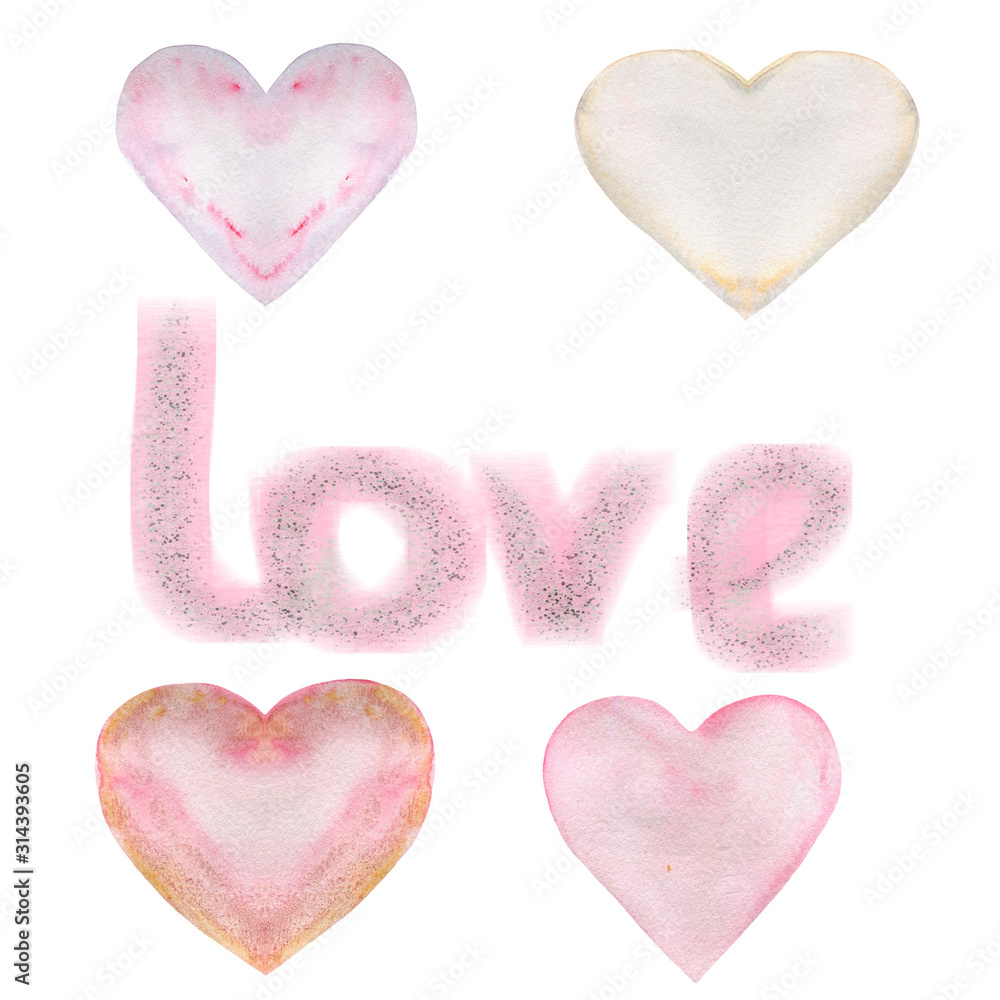 Plakat - Akwarela ilustracja serc i napis miłość. Ręcznie rysowane akwarelami i nadaje się do wszystkich... #314393605
