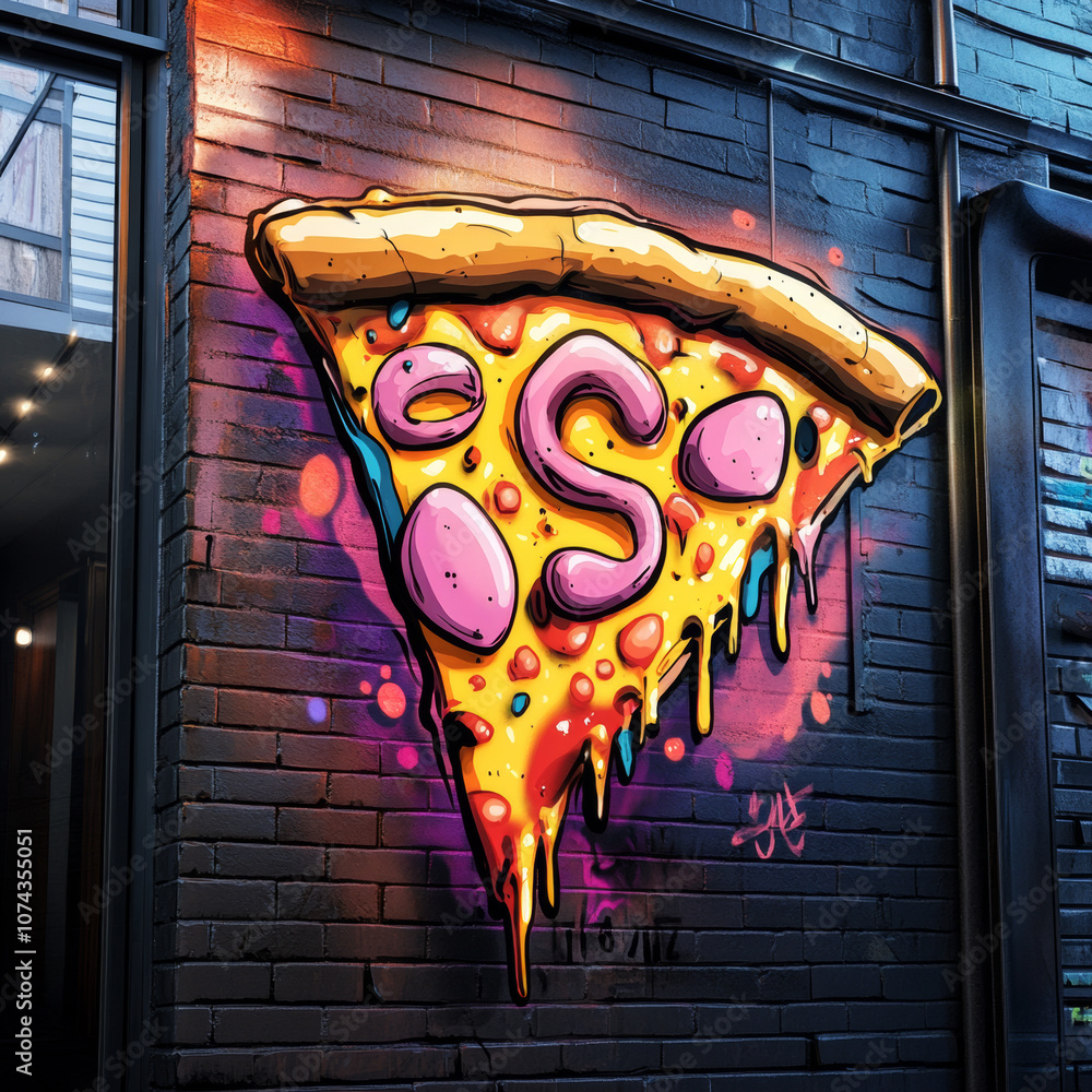 Obrazy Street Art - A graffiti art of a pizza slice on a brick wall with dripping cheese and pepperoni. #1074355051