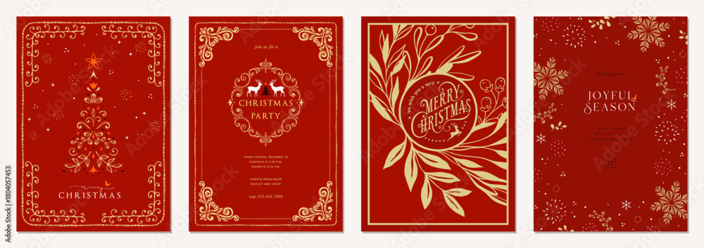 • Luxury Corporate Holiday cards with Christmas tree, reindeers, birds, ornate floral frames, background and copy space. For graphic and web design, social media banner.
