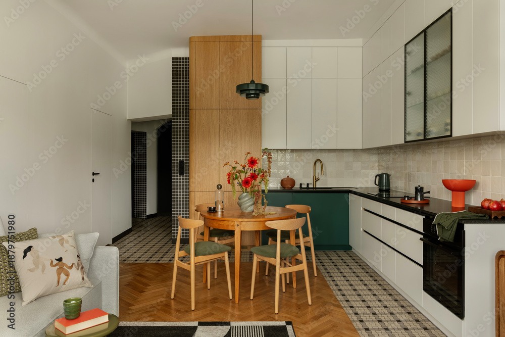 • Stylish Apartment Interior with Wood and White Accents and Dining Area