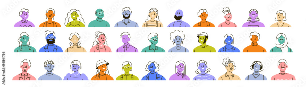 Set of colored abstract avatars, head portraits of diverse people. Happy smiling faces of men and women characters, modern drawn user profiles. Flat vector illustration isolated on white background