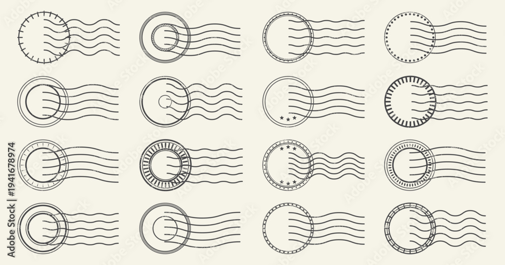 Vintage postal stamp marks set. Circular seals with wavy cancellation lines in retro ink style. Old mail postmark vector elements