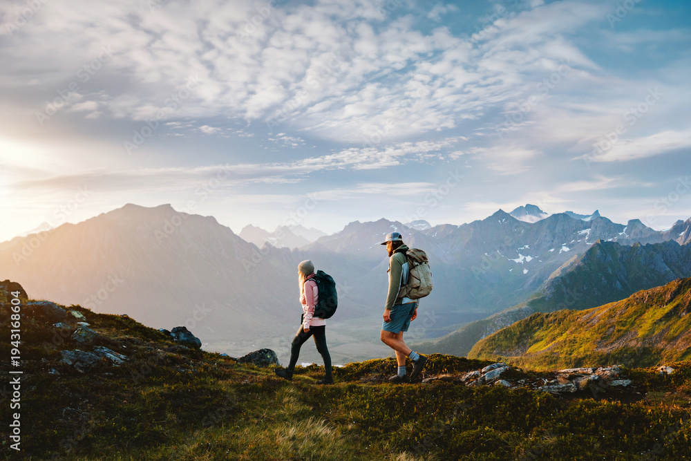 Couple friends hiking in Norway man and woman travel together explore mountain trails, active summer vacations healthy lifestyle family trekking outdoor extreme adventure trip in Lofoten islands