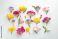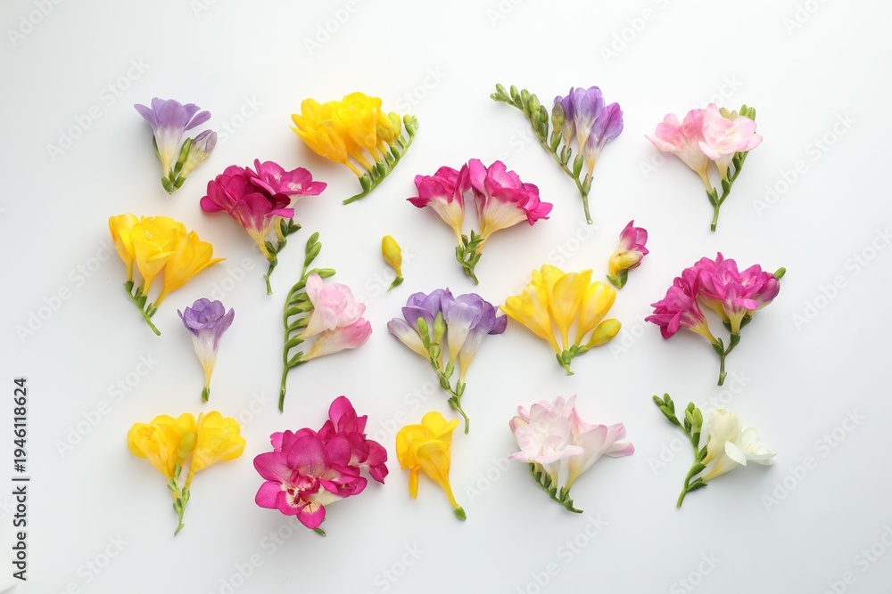 Beautiful freesia flowers on white background, flat lay