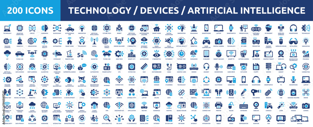 Huge set of 200 solid icons. Mega collection concept of artificial intelligence, technology, devices and digital. Vector illustration.