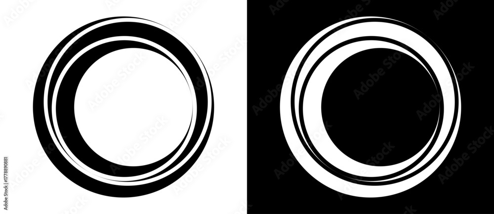 • Rotating art lines in circle shape as symbol, logo or icon. A black figure on a white background and an equally white figure on the black side.