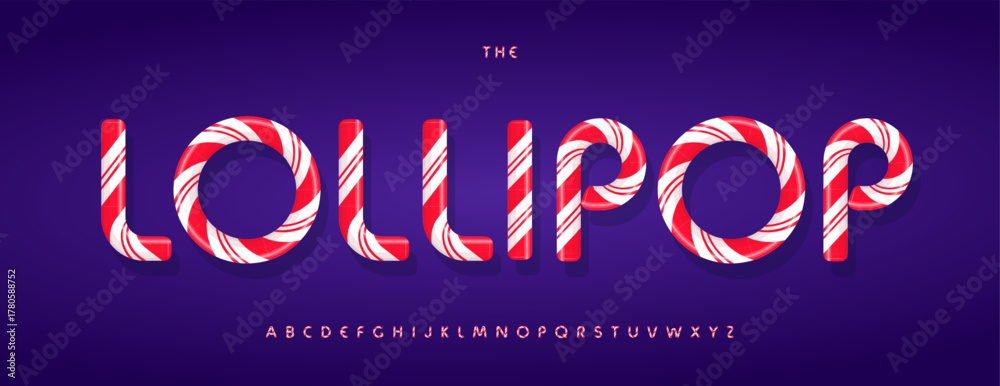 • Lollipop Cane Font, Sugar Candy Alphabet, Red White Stripes Letters for Birthday Party Headline Logo Typography, Funny Xmas Typescript, Bakery Sweet Dessert. 3D Kids Holiday Fonts. Vector Typeset