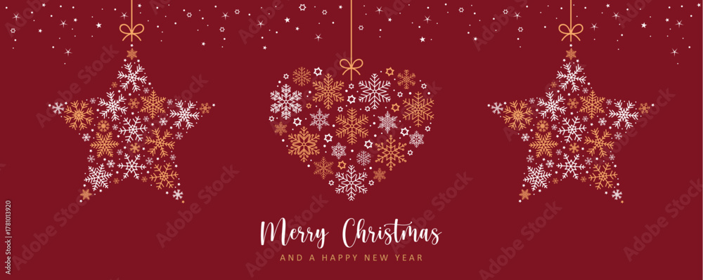 • merry christmas card with hanging snowflakes stars and heart vector illustration