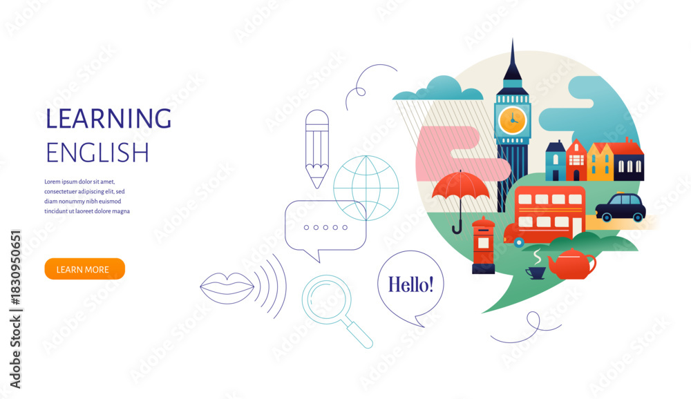 Plakat Folklor - English Language learning, concept design. Travel, tourism illustration of Great Britain. Speech... #1830950651