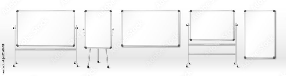 • Whiteboard office mockup with tripod stand - 3D realistic presentation board for business meetings and classroom training. Blank white magnetic surface with frame for charts and brainstorming session