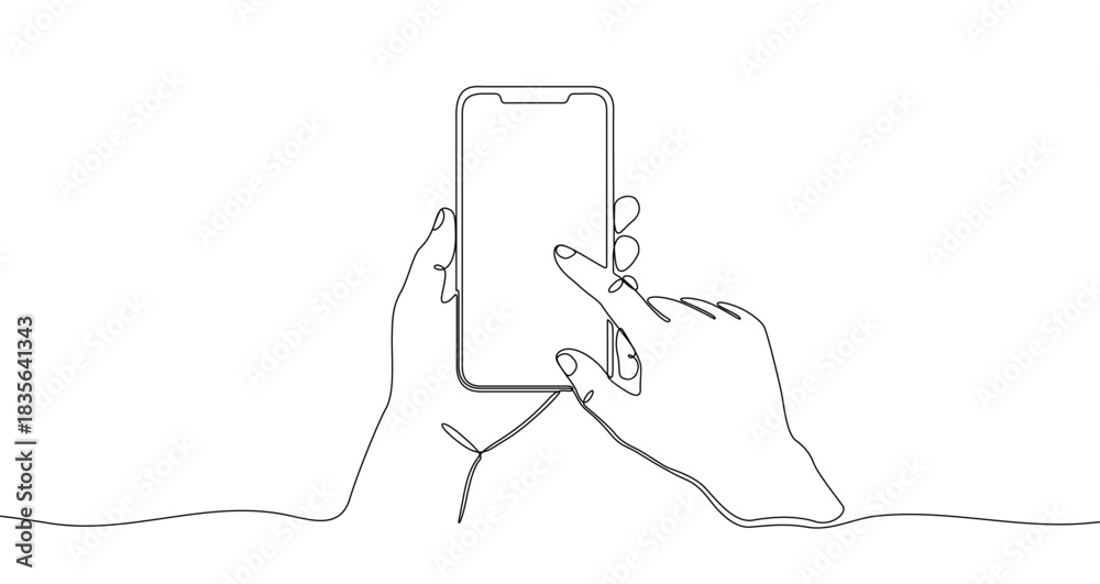 • Drawing of hands holding a smartphone with a touchscreen, in one line art style. Illustration with editable stroke. Vector illustration.