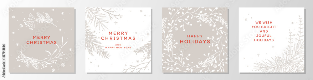 • Set of Christmas cards. New Year's winter elegant cards with snowflakes and fir tree branches on a neutral pastel beige and white background. Vector illustration