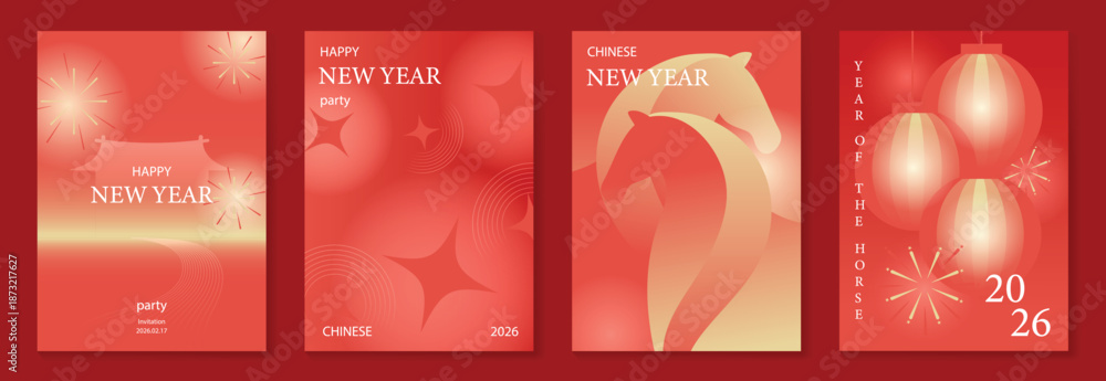 • Chinese New Year 2026 horse vector greeting card illustration with red lanterns golden ribbons and floral gradient background. Festive lunar new year design for invitation poster banner decoration.