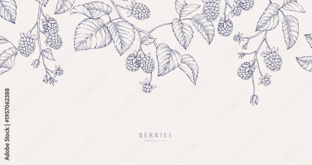 • Background with blackberries or raspberries and brunch. Detailed hand drawn ink floral illustration for invitation, wallpaper art or save the date card