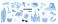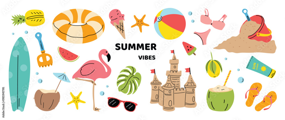 • Summer vibes beach element vector set with flamingo, surfboard, sand castle, swimsuit, float ring, coconut drink and tropical vacation icons. Hand drawn summer illustration for poster, sticker.