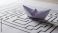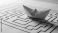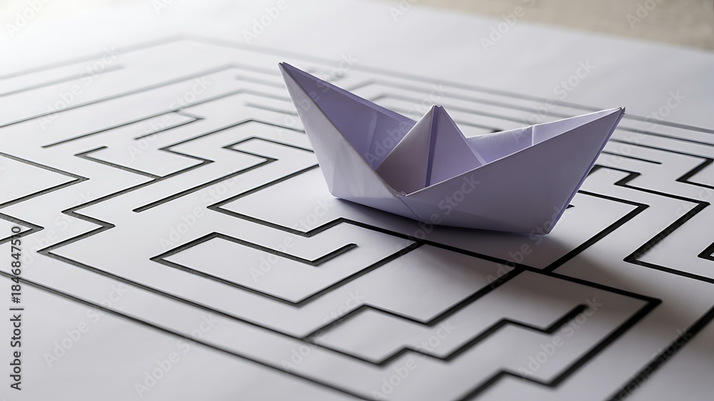 • White paper origami boat on a black and white maze labyrinth