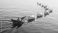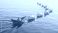 Plakat Origami - A single red paper boat leads a line of white boats across calm water #1858801682