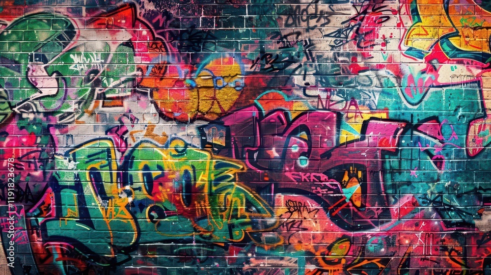 Urban Graffiti Wall. A frame of vibrant, colorful graffiti art and street murals.