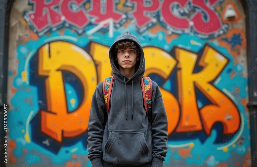 • Teen stands before graffiti-painted gateway wearing hoodie, backpack. Urban youth with serious look. Trendy fashion, youth subculture, street style themes. Student on walk. Gray sweatshirt, city
