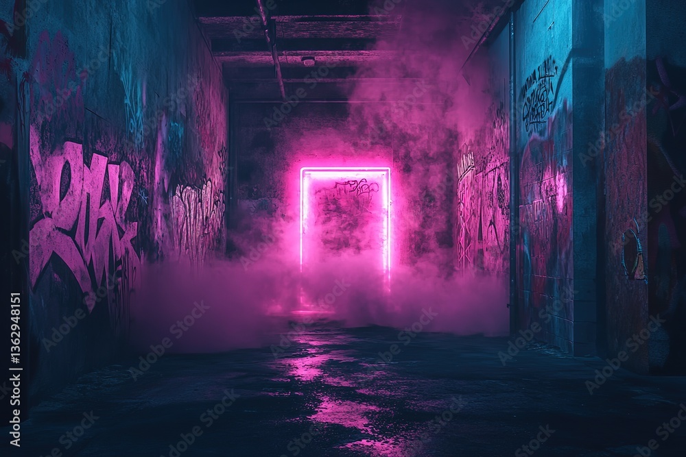 GraffitiCovered Urban Tunnel With Neon Light, Dark Concrete Walls, Smoke, and Vibrant Hues