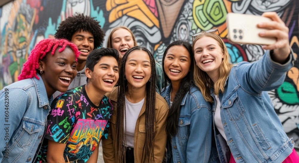 Plakat Street Art - A group of young adults taking a selfie in front of a colorful graffiti wall. #1604623909