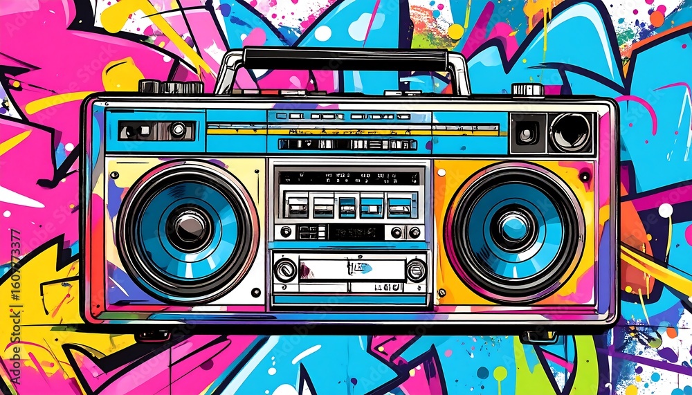 Plakat Street Art - Colorful boombox against a vibrant graffiti backdrop #1607773377