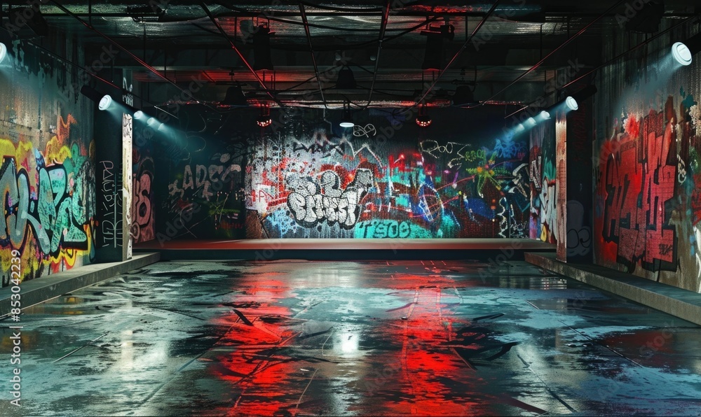 Plakat Street Art - Fashion runway with metallic floor, urban graffiti backdrop #853042239