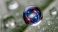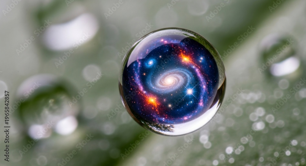 • Cosmic galaxy reflected in a water droplet on a green leaf surface