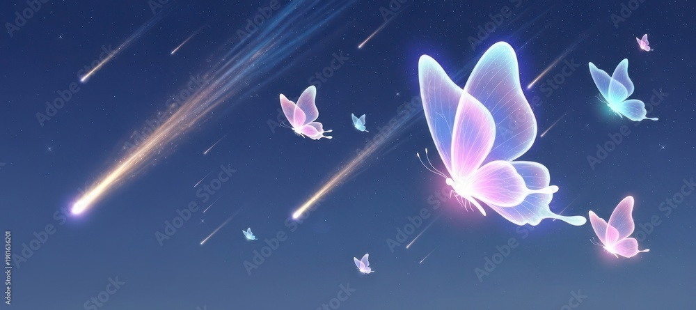 • Glowing butterflies and falling stars in dark sky fantasy conceptual illustration
