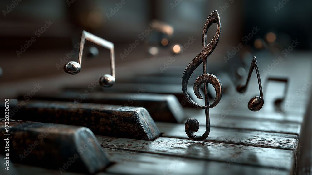 Plakat Muzyka - Artystyczny obraz klawiatury fortepianu z unoszącymi się metalicznymi nutami i kluczem... #1722020670
