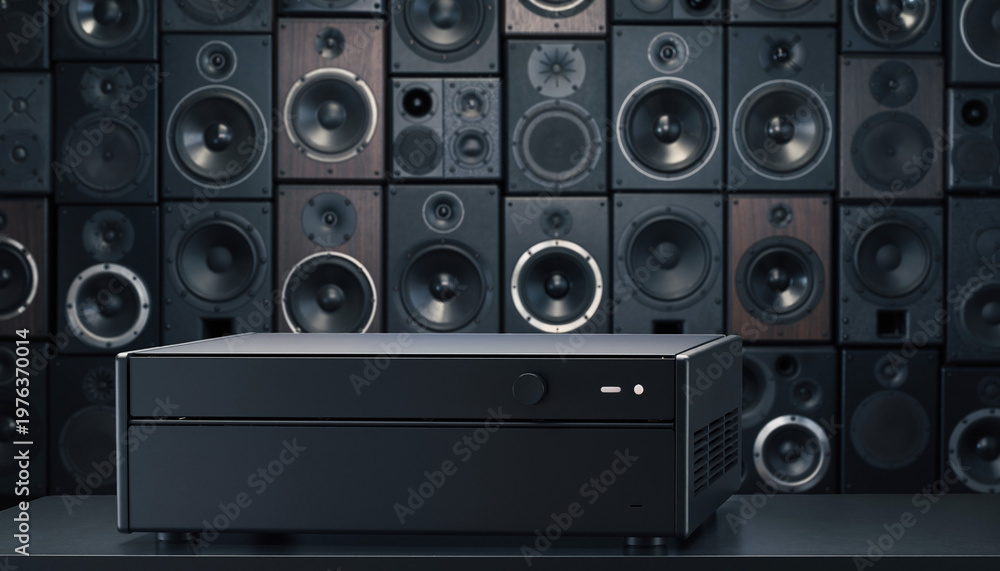 Plakat Muzyka - Wzmacniacz na tle ściany głośników #1976370014