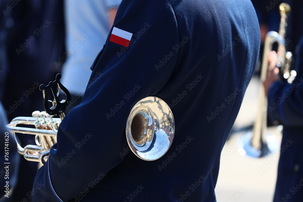 Plakat Muzyka - Ślubowanie policjantów w niebieskich mundurach. #761741620