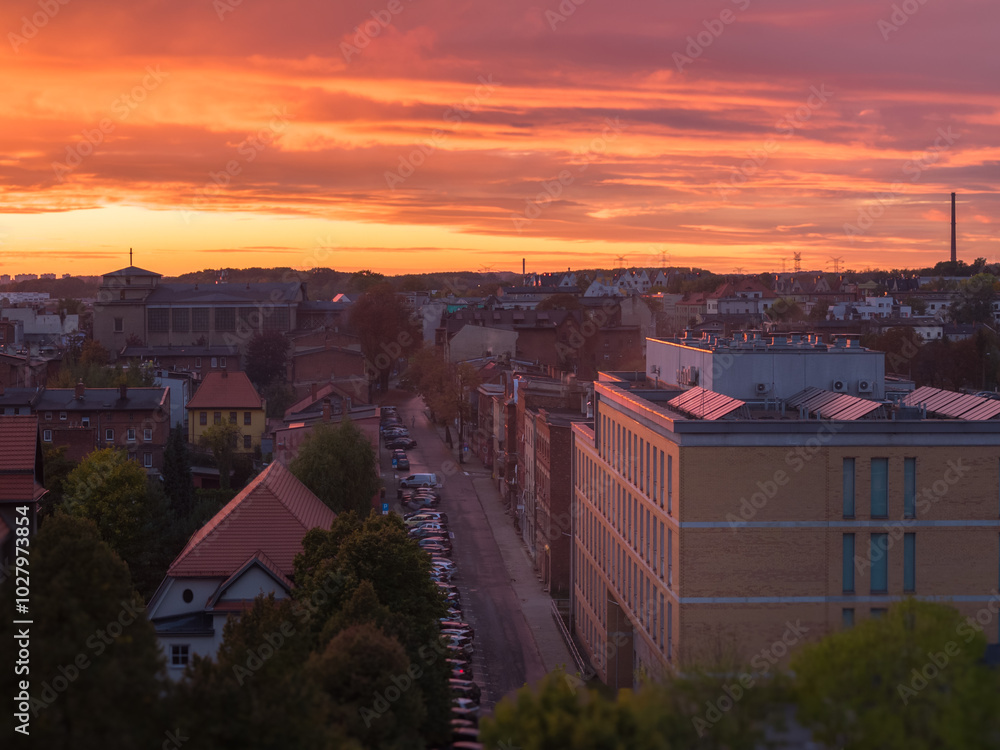 Plakat Panorama - Piekarskie Centrum Medyczne w Piekarach Śląskich – widok z drona o zachodzie słońca #1027973854