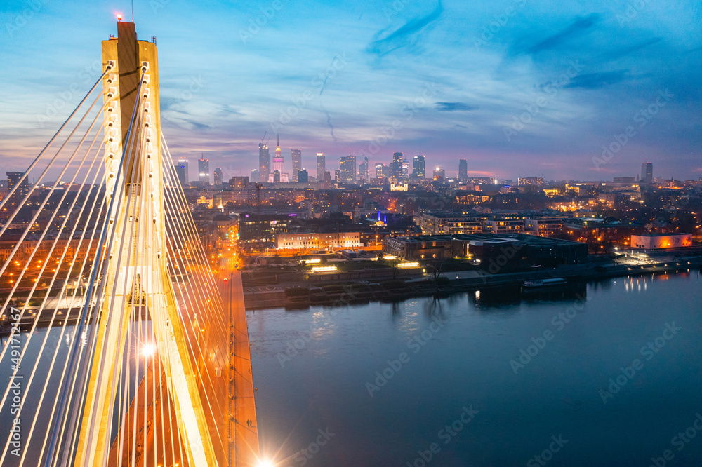 Plakat Panorama - Most Świętokrzyski i centrum Warszawy o zachodzie słońca, widok z lotu ptaka #491712167
