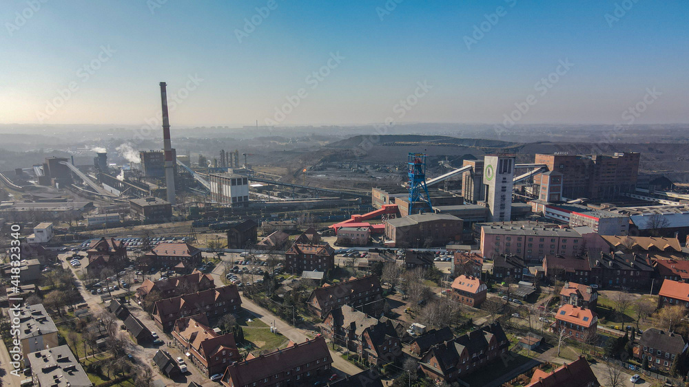 Panorama - miasto Radlin i kopalnia węgla Marcel z koksownią z lotu ptaka zimą na Śląsku w Polsce, krajobraz... #418323340