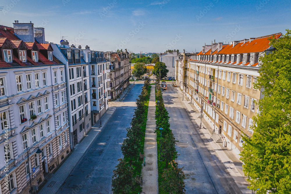 Panorama - Dolne Miasto district in Gdańsk. Beautiful streets, old buildings, the Motława River. Morning. #667644441
