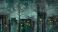 • Miasto nocą z konturami budynków w tle oraz strasznymi drzewami w pierwszym planie. Niebo jest ciemnoszare, a miasto oświetlone jest odblaskami świateł.