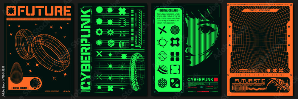 • Futuristic and Cyberpunk Poster. Retrofuturistic posters with cute anime girls, hi-tech, y2k geometric shapes. Set of four stylized posters futuristic and cyberpunk themes in vibrant orange and green.