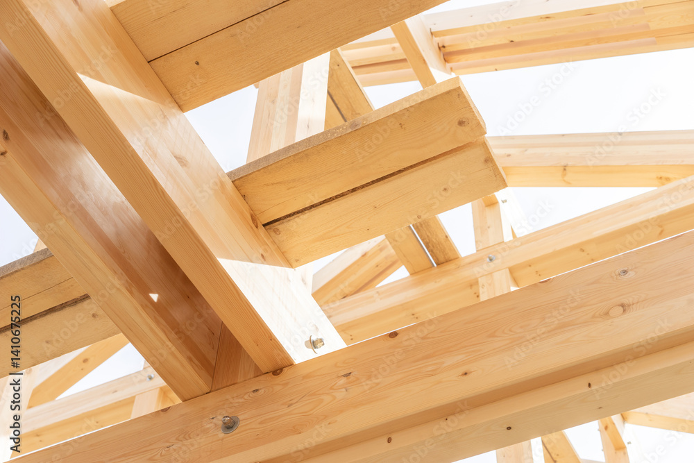 Przestrzeń - Close-up view of wooden beams and joints in a roof under construction, showcasing structural... #1410675225