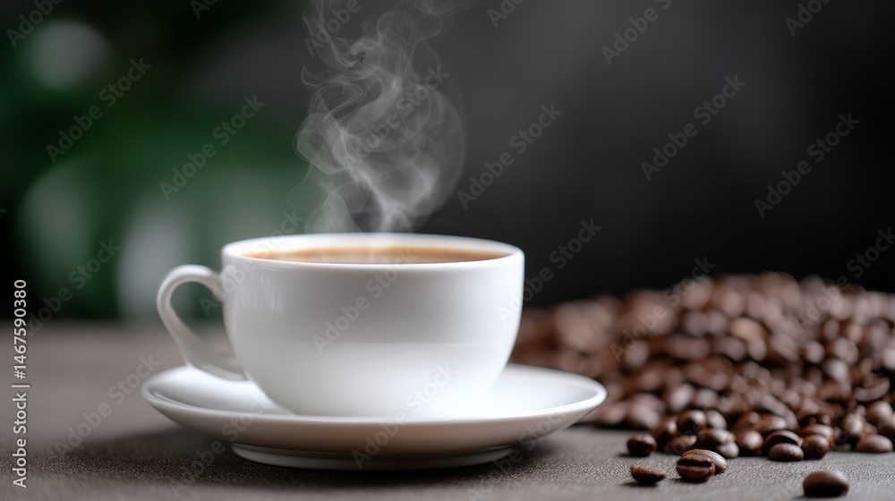 Kawa - White coffee cup with steam rising from it sits on a table with a pile of coffee beans #1467590380