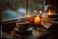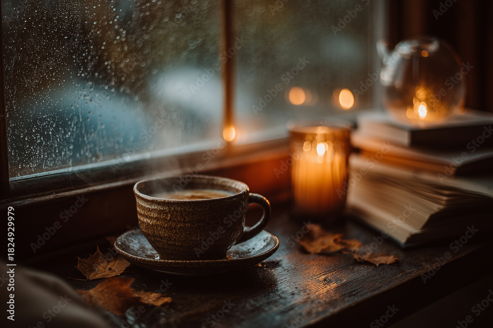 • Przytulna, jesienna scena. Kubek parującej kawy na starym, otwartym notatniku, otoczony liśćmi i szyszkami, w ciepłym świetle świec przy oknie w deszczu.