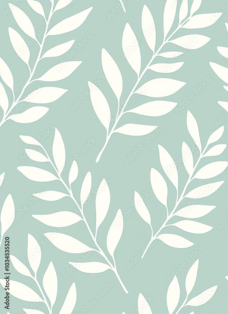 • Light blue and white pattern with leaves, pastel green background, simple, minimalist design.