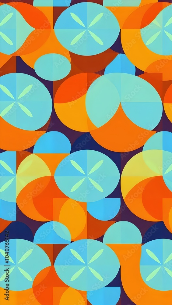• Colorful abstract geometric pattern featuring circles and shapes in blue, orange, and yellow tones. Generative AI