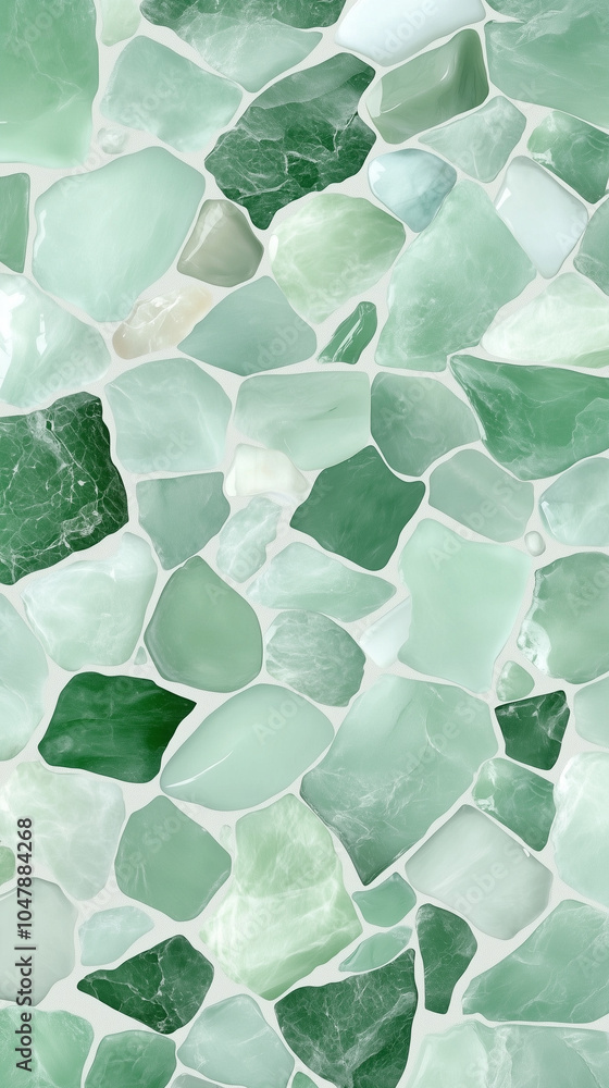 • sea glass fragments in mint and emerald green tones creating natural mosaic pattern on white background